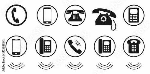 Various communication devices including rotary phones and smartphones in black and white icons, vector art