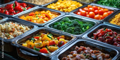 buffet, food, tray, stainless steel, metal, line, colourful, various, item, arrangement, red pepper, yellow pepper, broccoli, fried rice, vegetable, catering, eatery, eatery, dining, lunch, dinner, eat, fresh, healthy, delicious, appealing, appetising, tasty, flavorful, tempting, culinary, cookery, epicure, preparation, cooking, ingredient, meal, dish, serving, portion, selection, variety, choice, option, abundance