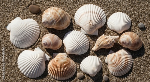 Various seashells on sandy background