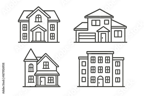 Various styles of residential buildings outlined in simple black lines showcasing diverse architectural design concepts and home styles in vector cartoon illustration with transparent background