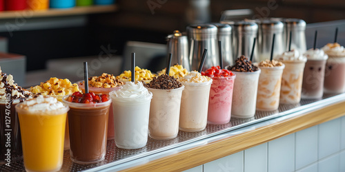 Various types of fruit milkshakes on a counter of cafe