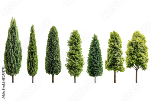 Various types of green trees displayed in a row showcasing different shapes and sizes in natural lighting