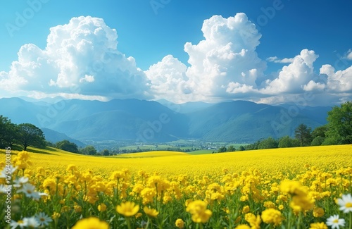 Vast canola field stretches across rolling hills beneath brilliant blue sky. White clouds drift above distant mountains creating picturesque landscape. Vibrant scene agricultural beauty, sunny rural
