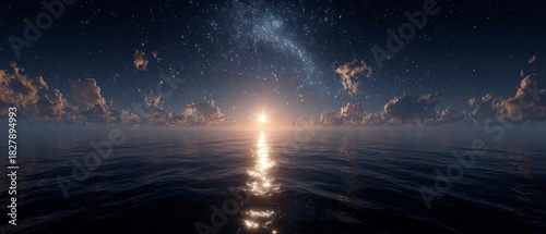 Vast dark ocean surface reflects bright central light beneath a starry night sky with scattered clouds