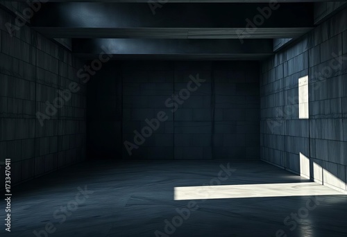 Vast, empty black concrete room, stark shadows, shadow, background