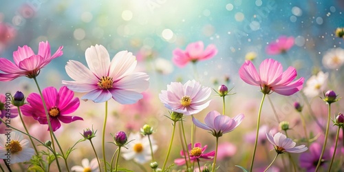 Vast expanse of cosmos flowers swaying gently in the breeze, their delicate petals shimmering with subtle colors and intricate patterns , serene atmosphere, vibrant colors