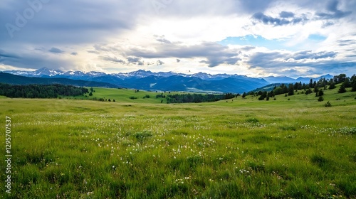 Vast green field under a dramatic sky filled with clouds and distant mountain ranges : Generative AI