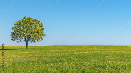 Vast green field with blooming flowers and a lonely tree under a clear blue sky in springtime