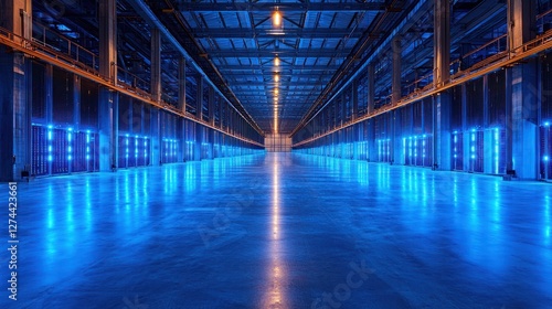 warehouse, industrial, interior, blue, light, roomy, modern, design, architecture, empty, storage, facility, space, technology, clean, line, symmetry, illumination, environment, contemporary, urban, infrastructure, logistic, production, factory, area, open, perspective, shadow, reflections, minimalism, layout, energy, vibrant, cool, atmosphere, service, equipment, organisation, management, efficiency, scale, depth, visual, aesthetic, engineering, planning, operation, safety