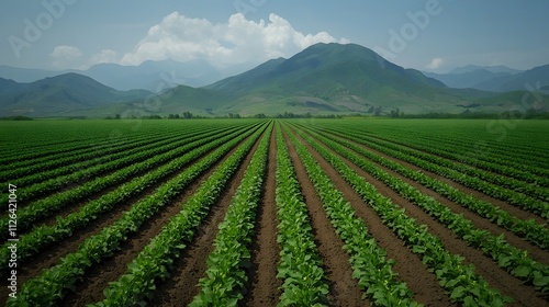 field, agriculture, crop, greenery, mountain, farming, landscape, serenity, nature, sky, outdoors, row, vegetation, growth, harmony, calmness, rural, environment, earth, cultivation, freshness, peaceful, summer, natural, ecosystem, fertile, expanse, mountainous, scenic, panoramic, rich, palmy, dirtied, scenery, blue, expansive, farmland