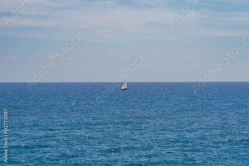 Vast Mediterranean Sea with a solitary sailboat on the horizon under light clouds on a clear day.