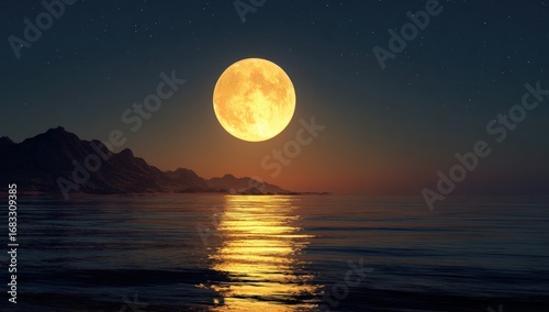 moon, large, ocean, night, sky, star, mountain, water, gold, sunrise, sunset, light, dark, calm, huge, tranquil, serene, beautiful, nature, landscape, digital, image, illustration, dramatic, evening, morning, horizon, glowing, yellow, full, round, rocky, silhouette, illuminated, peaceful, night time, space, astronomy, serenity