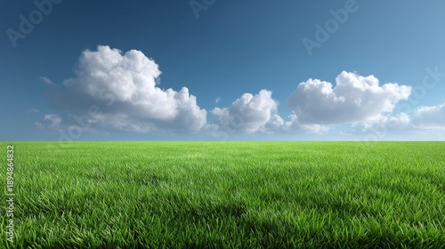 Vast Open Field of Green Grass Under Bright Blue Sky with Fluffy White Clouds on a Sunny Day, Perfect for Nature and Landscape Themes