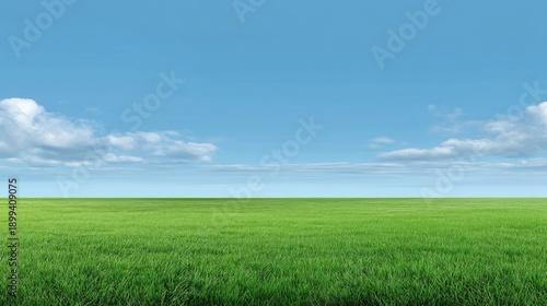 Vast Open Green Field Under Bright Blue Sky with Fluffy White Clouds, Ideal for Nature and Outdoor Themes in Stock Photography