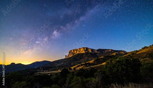night sky, star, milky way, galaxy, astronomy, space, universe, mountain, landscape, nature, outdoors, wilderness, scenic, view, vista, horizon, glow, light, darkness, shadow, silhouette, foreground, foliage, tree, bush, vegetation, earth, planet, celestial, cosmos, huge, expansive, deep, blue, orange, yellow, dark, night, adventure, exploration