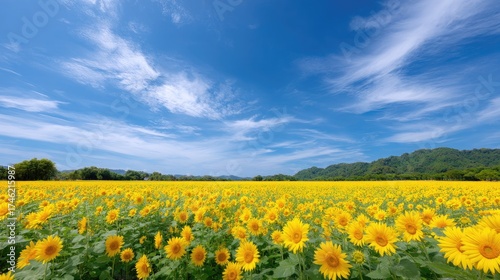 Vast Sunflower Field Under Bright Blue Sky with Wispy Clouds and Green Mountains in Background
