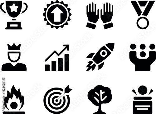 vector, icon, achievement, success, award, trophy, medal, growth, progress, leadership, teamwork, target, goal, ambition, motivation, black, white, simple, minimalist, graphic, design, illustration, business, corporate, strategy, planning, development, innovation, startup, flames, fire, rising, upward, crown, king, winner, applause