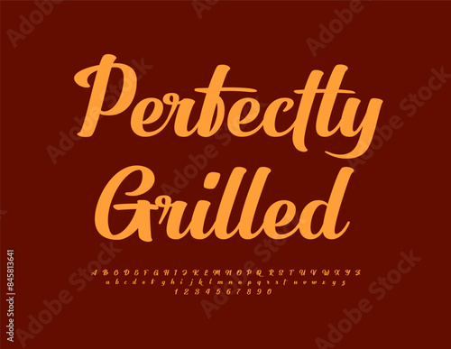 Vector advertising banner Perfectly Grilled. Stylish Calligraphic Font. Beautiful Cursive Alphabet Letters and Numbers set.
