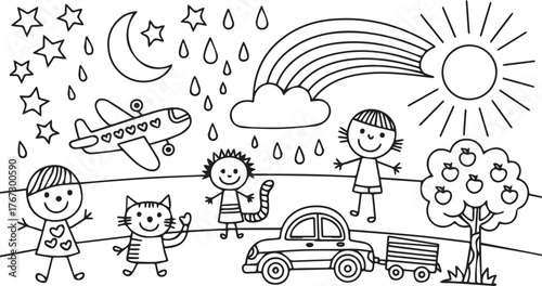 colouring, page, children, animal, nature, sun, moon, star, rainbow, cloud, rain, aeroplane, cat, tree, apple, car, trailer, boy, girl, smile, happy, drawing, cartoon, line, art, design