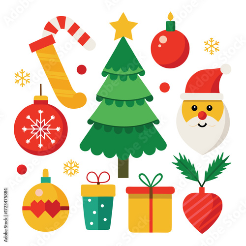 Vector art of a festive collection of christmas icons including a decorated christmas tree, santa claus, a stocking, gifts, ornaments, and candy cane, all isolated on a