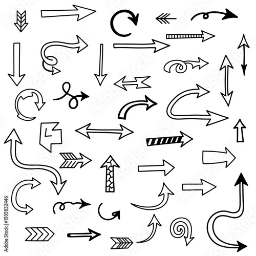 Vector art of Collection of hand-drawn arrow illustrations isolated on white background, featuring various directions, shapes, and styles for design and navigation purposes.