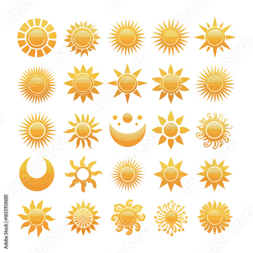 Vector art of collection of sun icons in various styles and shapes isolated on white background