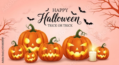 Vector art of happy halloween pumpkins with bats and candle on pink background illustration