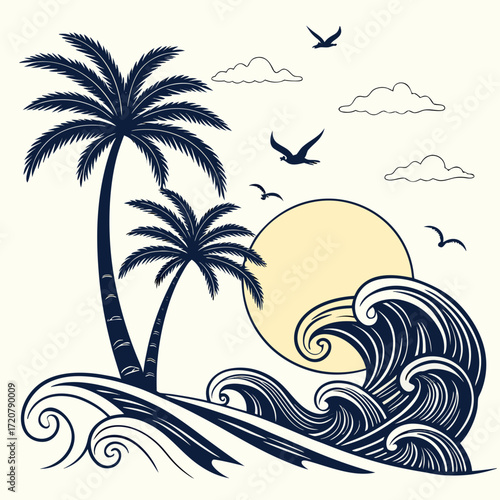 Vector art of stylized illustration of a tropical island with palm trees and crashing waves under a sun and sky with birds