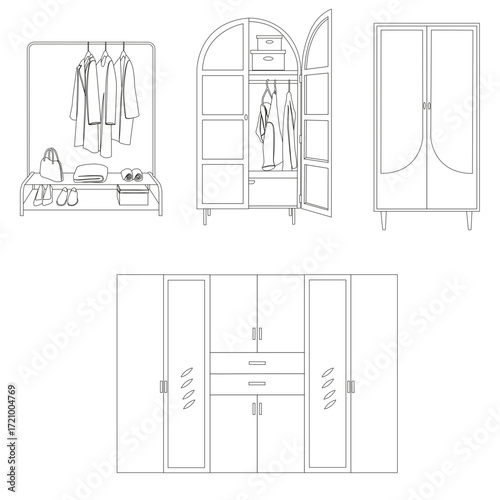 clothes rack, bedchamber, closet, cabinet, drawer, contemporary, home interior, furniture, storage, vector, household, home decor, interior design, living space, organisation, schematic, outline, line art, design element, architecture