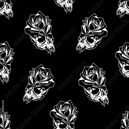 Vector black and white seamless pattern of geometric skull with rose.In modern minimalism art style.