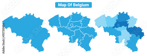 Vector Blue Belgium political maps with borders regions simple flat illustration set
