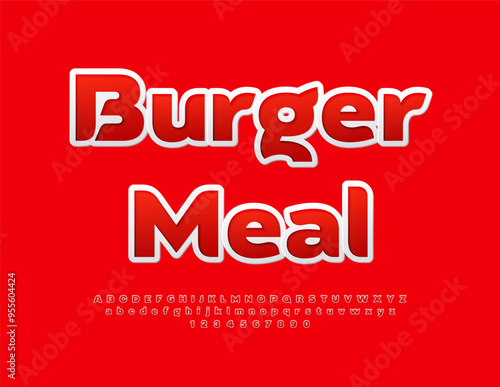 Vector bright badge Burger Meal. Red sticker Font. Artistic Alphabet Letters, Numbers and Symbols
