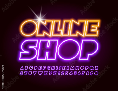 Vector bright sign Online Shop. Abstract Neon Font. Creative electric Alphabet Letters and Numbers