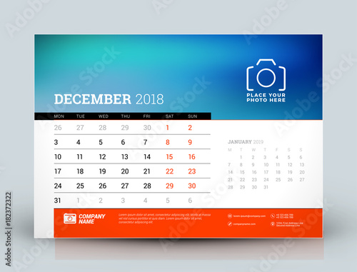 Vector calendar design template. December 2018. Place for photo. Red and black colors. Two months on the page. Week starts on Monday