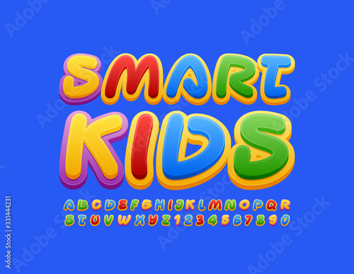 Vector colorful logo Smart Kids. Cute Bright Font. Creative Alphabet Letters and Numbers.