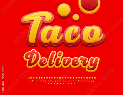 Vector Creative signboard Taco Delivery. Artistic Yellow and Red Font. Handwritten Digital Alphabet Letters and Numbers set.