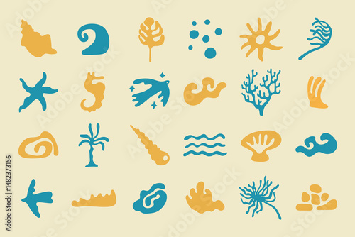 vector, print, summer, holiday, beach, shape, floral, palm, ocean, collection, vacation, groovy, wavy, wave, water, flower child, decor, wall, hand-drawn, cover, stationery, abstract, seaweed, doodle, coral, illustration, algae, template, botany, retro, branding, design element, bohemian, sun, minimal, surface, vibe, tropical, sea, shell, surf, bird, resort, simple, underwater, marine life, icon