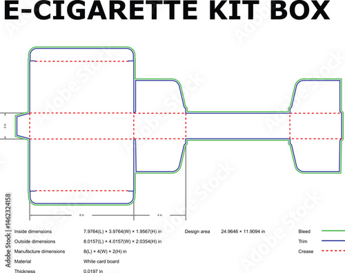 Vector diagram of an e-cigarette kit box showing dimensions and design details
