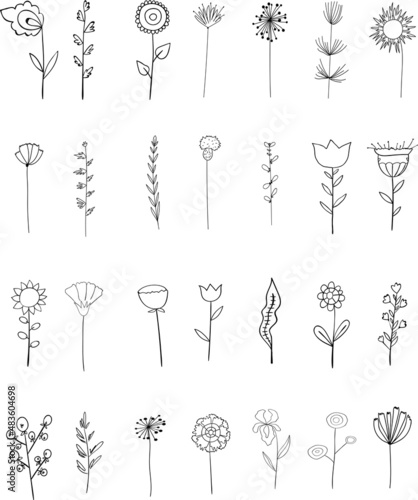 Vector elements. Set of plants and flowers. Outline sketched style.