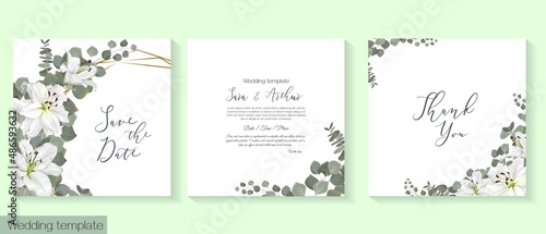 Vector floral template for wedding invitation. White royal lilies, eucalyptus, green plants and leaves.