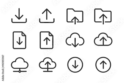Vector icon set showcasing various upload and download symbols for digital and cloud applications