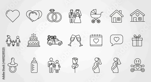 love, nubes, wedding, marriage, family, baby, icon, set, vector, illustration, line, art, vignetting, doodle, hand-drawn, couple, bride, groom, children, newborn, pregnancy, pregnant, home, house, ring, cake, gift, celebration, romantic, human relationships, life, people, symbol, graphic, design, outline, simple, minimal, isolated, white, black, mother, father, maternity, parenthood, infant, toddler, pushchair