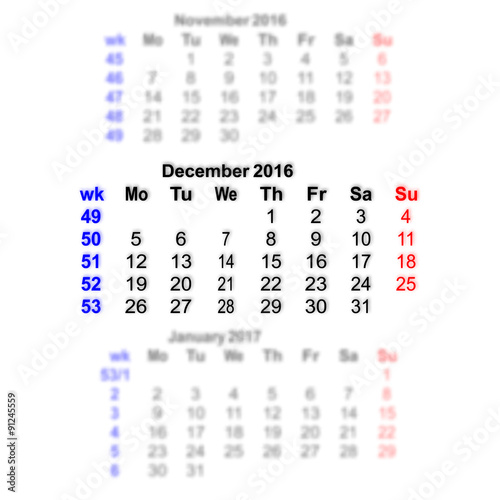 Vector illustration 2016 calendar grid. Month on a blurred background of previous and subsequent months. All characters on a transparent background can be placed on any image. Week starts on Monday.