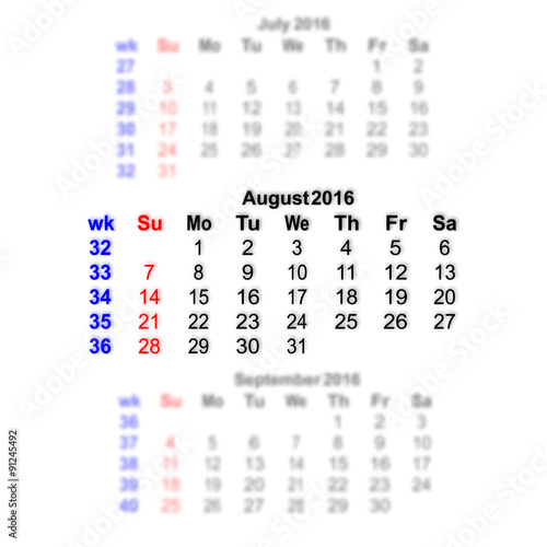 Vector illustration 2016 calendar grid. Month on a blurred background of previous and subsequent months. All characters on a transparent background can be placed on any image. Week starts on Sunday.