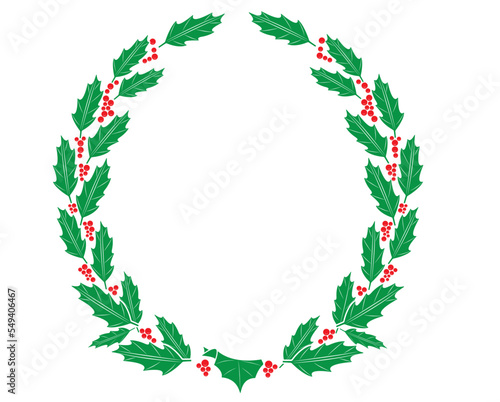 Vector illustration Christmas wreath of holly with red berries. Green leaf with greeting with text Merry Christmas. Icon isolated on white background. New Year's Eve celebration in December