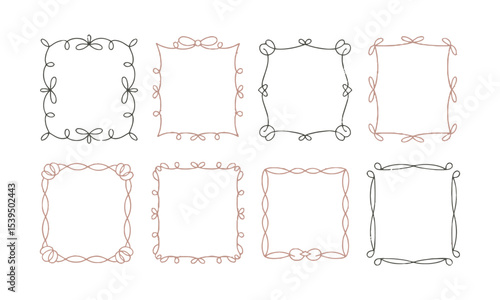 Vector illustration featuring a collection of whimsical, hand-drawn rectangular frames, Include a diverse range of frame designs, such as ribbon-tied borders, easily editable and scalable.