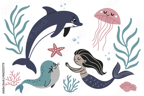 fish, sea, cartoon, animal, dolphin, vector, ocean, illustration, water, set, whale, shark, marin, octopus, animal, nature, turtle, underwater, aquarium, starfish, collection, tropical, wildlife, life, design