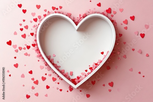 Vector illustration of a white heart-shaped frame with red and pink confetti on a background for a Happy Valentine's Day card design