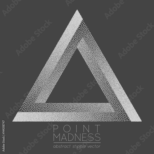 Vector illustration of abstract dotted symbol Penrose triangle. Sacred geometry sign made in stippling technique. Isolated halftone symbol. Pointillism. Penrose tribar.