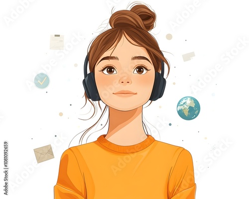 vector illustration of customer care worker with head phone, wear office outfit in a middle of the picture. globe icon, call icon, thinking icon, envelope icon, clock icon located around her.